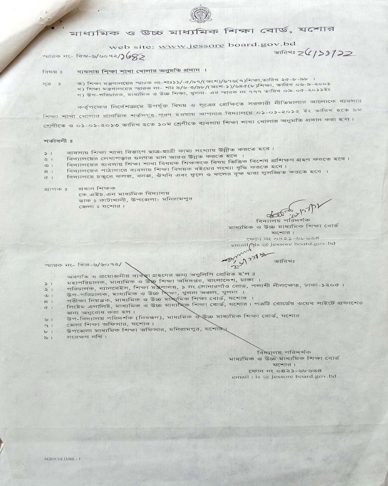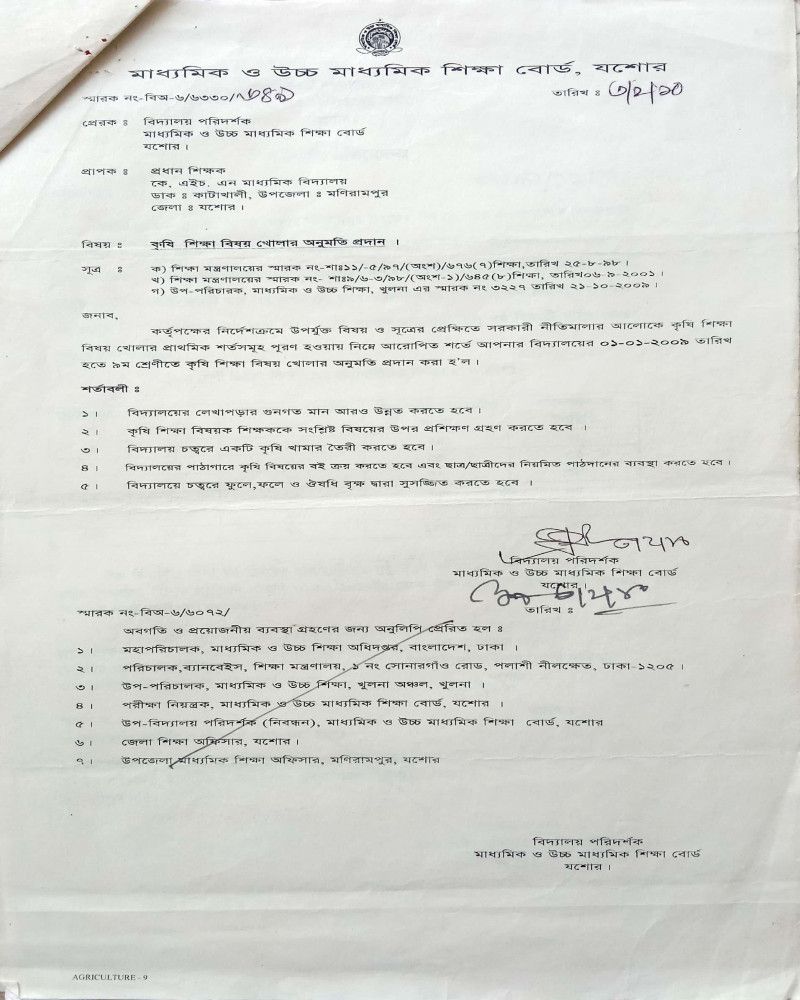 কৃষি শিক্ষা বিষয় খোলার অনুমতি পত্র