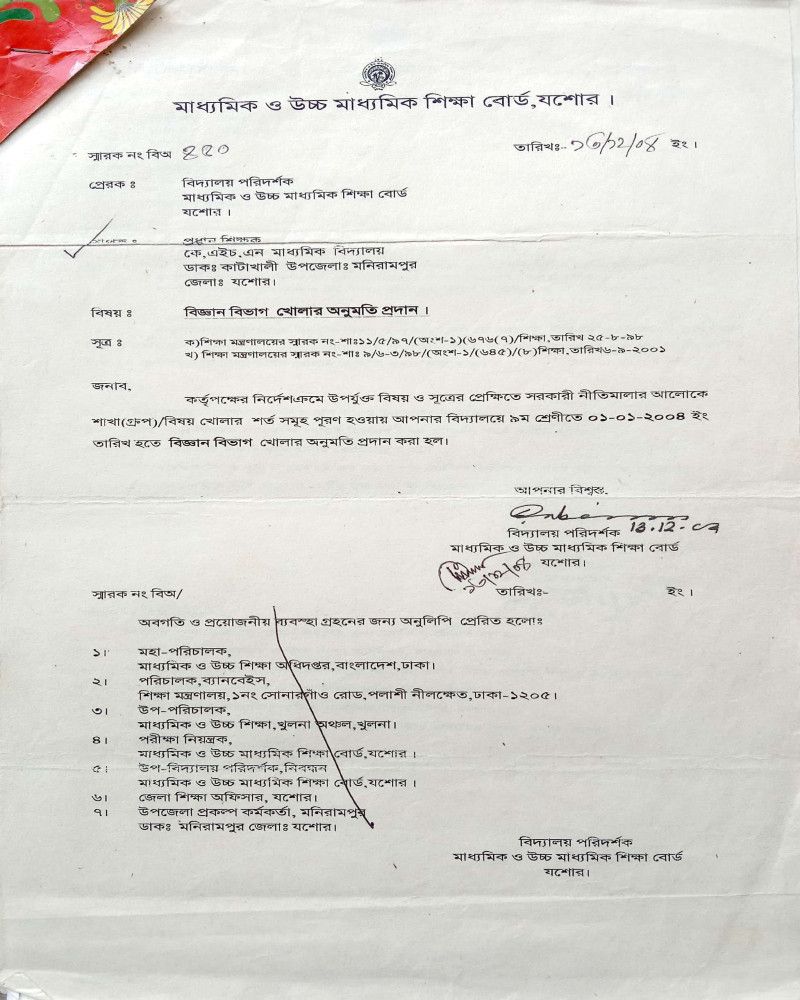 বিজ্ঞান বিভাগ খোলার অনুমতি পত্র